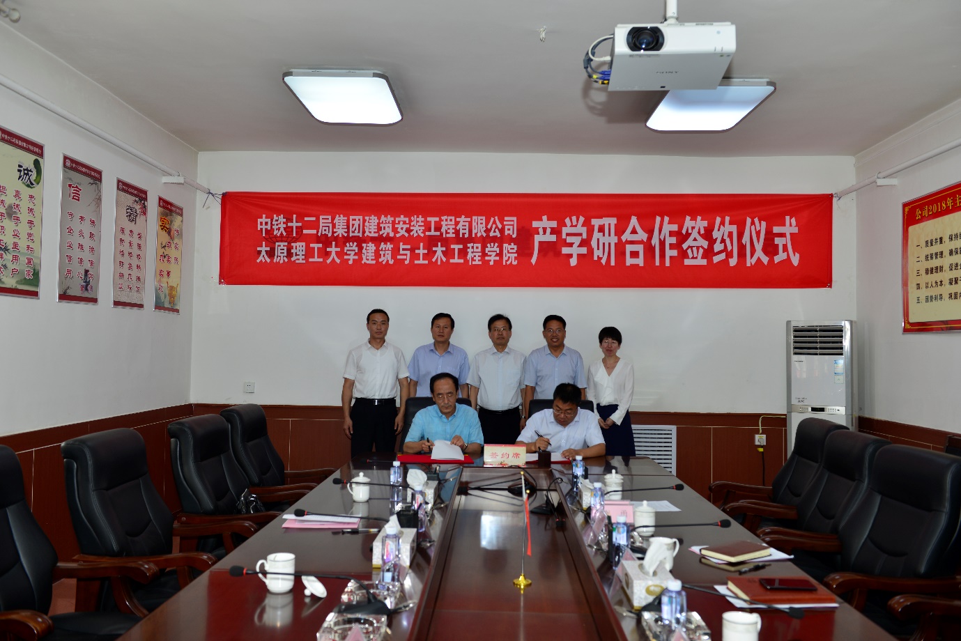 2018年7月8日上午10点,永利304官网唯一建筑与永利304官网唯一与中铁十二局集团建筑安装工程有限公司在建安公司会议室举行产学研合作框架协议签署仪式及产学研合作揭牌仪式。建筑与土木工工程学院院长雷宏刚教授、土木系主任董晓强教授、土木实验中心主任刘元珍教授,中铁十二局集团建筑安装工程有限公司董事长、总经理蔡英康、党委书记姜振生、公司副总经理、总工程师王中军、副总经理卢会永、副总工盖宏、副总工解明旭、副总经济师李勇、科技部副部长范伟、科技部副部长王美静、测试中心副主任王欢、科技部部员杜莎莎出席了签约及揭牌仪式。