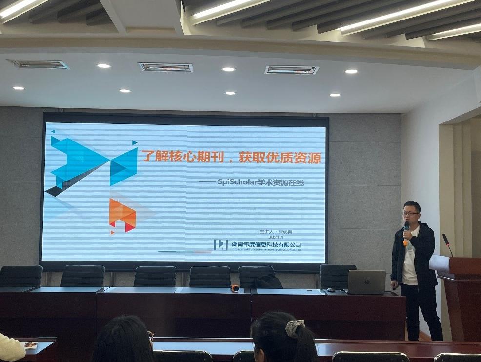 2021年4月26日下午,湖南纬度信息科技有限公司产品经理康虎兵应邀在学院五层会议室进行了主题为《文献资源检索》的报告会,永利官网师生积极参与,报告会由图书馆信息咨询部卢同同主任主持。