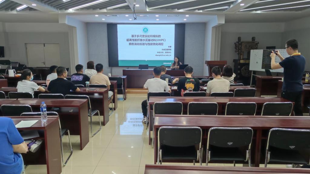 报告会由沈玲华老师主持。张慧副教授以“基于多尺度实验和模拟的超高性能纤维水泥基材料(UHPC)损伤演化机理与性能优化调控”为题,报告了相关领域的研究进展,并结合自身求学和工作经历,生动分享了职业发展规划和心得体会,引发了与会学生的共鸣。黄宇劼副教授针对“非均匀复合材料微结构高精度表征与复杂细观断裂力学模拟”研究,重点阐述了混凝土材料的细观结构分析方法,并结合自身从事复杂建筑结构计算与设计的丰富经验,从学习与应用互促、科学与技术相长的高度,为听众作了一场精彩的报告,充分激发了与会师生的头脑风暴,起到了交流互鉴的良好效果。