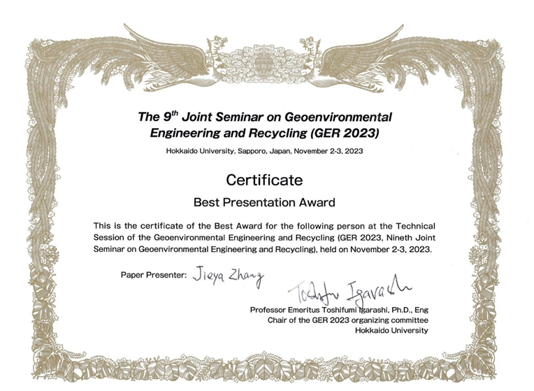 学术报告闭幕式上,大会学术委员会经投票评选出了研究生最佳报告奖,张洁雅喜获殊荣。同时,大会宣布由永利官网承办第十届环境岩土工程与循环利用国际研讨会,董晓强介绍了校院的基本情况和学科发展现状,向大会组委会的信任表示了感谢,诚挚邀请大家2024年相聚永利304官网唯一。