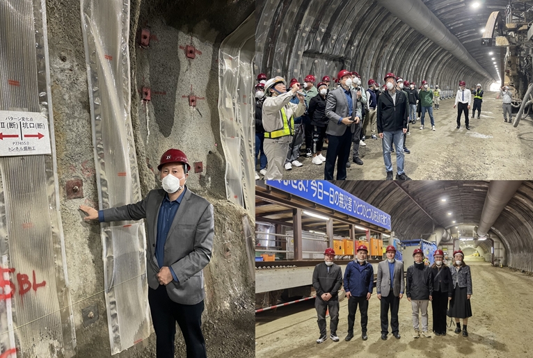会场研讨环节结束后,与会代表前往Niki隧道进行现场考察,该隧道隶属日本5号国道,采用“新奥法”开挖与锚杆支护方法,最大开挖深度76 m,洞身主体穿越砂岩地层,地形地质条件复杂。在掌子面附近,参会代表现场听取了技术人员对于施工进程和安全管理的介绍,切身体会到了该工程现场在通风、安全与施工规范性层面上的先进性,并就各国安全与文明施工经验交换了意见。