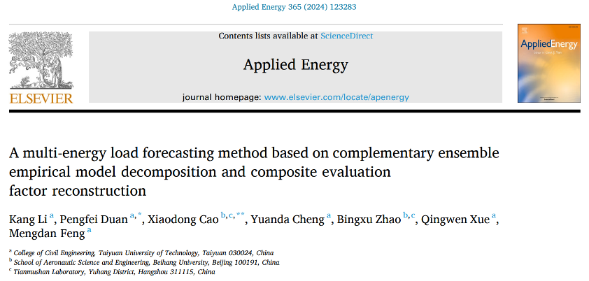 近日,永利官网2022级硕士研究生李康在国际知名期刊《Applied Energy》发表了题为《A multi-energy load forecasting method based on complementary ensemble empirical model decomposition and composite evaluation factor reconstruction》的研究论文,李康为第一作者、导师段鹏飞为通讯作者,建筑环境控制与可持续能源应用团队程远达、薛庆雯等为共同作者,永利304官网唯一为第一作者单位。