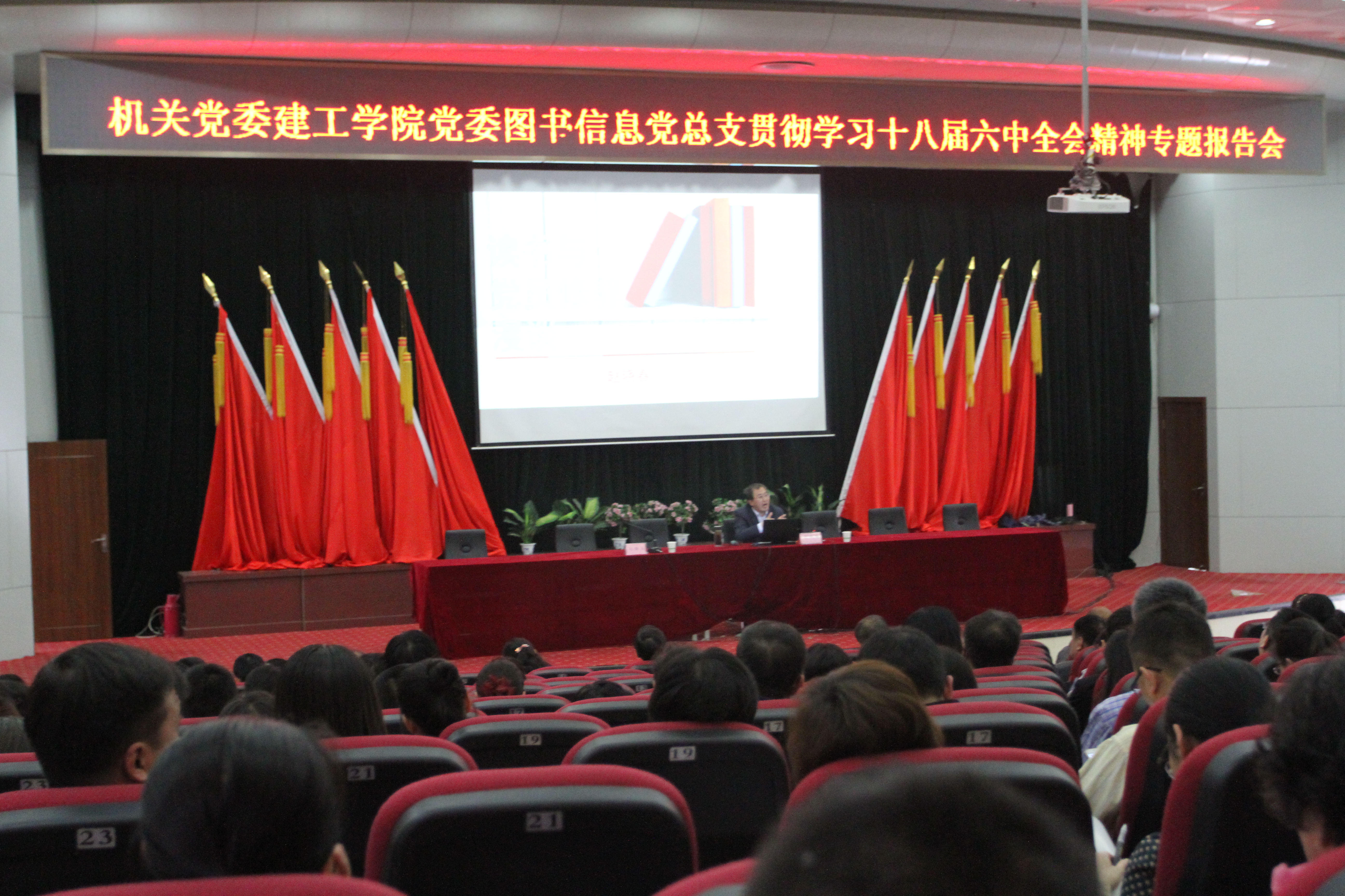 4月28日下午,建工学院党委、机关党委、图书信息党总支在博学馆报告厅举行贯彻十八届六中全会精神学习研讨班专题报告会。山西省体育局副局长赵晓春教授应邀作了题为“读书与党员修养”的专题报告。建工学院、机关党委、图书信息党总支全体党员参加了此次讲座。讲座由建工学院党委书记周伟主持。