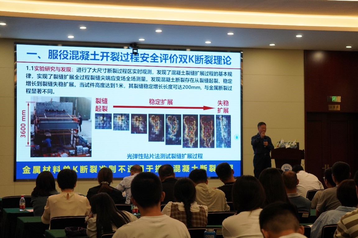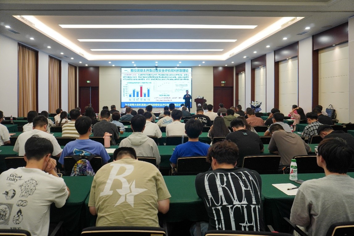 徐世烺报告以“从混凝土的断裂韧性到韧性断裂的混凝土”为题,从国家低碳发展导向讲起,介绍了混凝土结构安全韧性评价的双K断裂理论、高韧性混凝土材料与结构性能和在重大工程中的应用。徐院士创新建立的双K断裂理论模型揭示了裂缝起裂到失稳破坏全过程的应力奇异性量化规律,并采用微宏多尺度增强增韧技术极大地提升了水泥基复合材料的宏观强度和变形能力,在混凝土材料性能方面实现了从脆性易裂到超高韧性的重大转变。报告理论层次高,成果在三峡大坝二期和三期等国家级重大工程项目中有应用。徐世烺教授的报告关注学科前沿,针对混凝土断裂与高韧性材料提出了独创性的理论与见解,现场参会师生反响积极,学术气氛活跃。