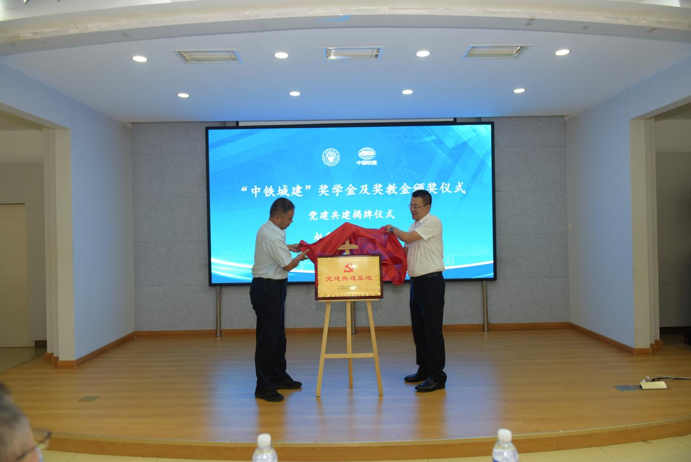 颁奖仪式上,赵惠民作为学院代表和中铁城建集团第一工程有限公司代表周磊共同为院企党建共建基地揭牌。