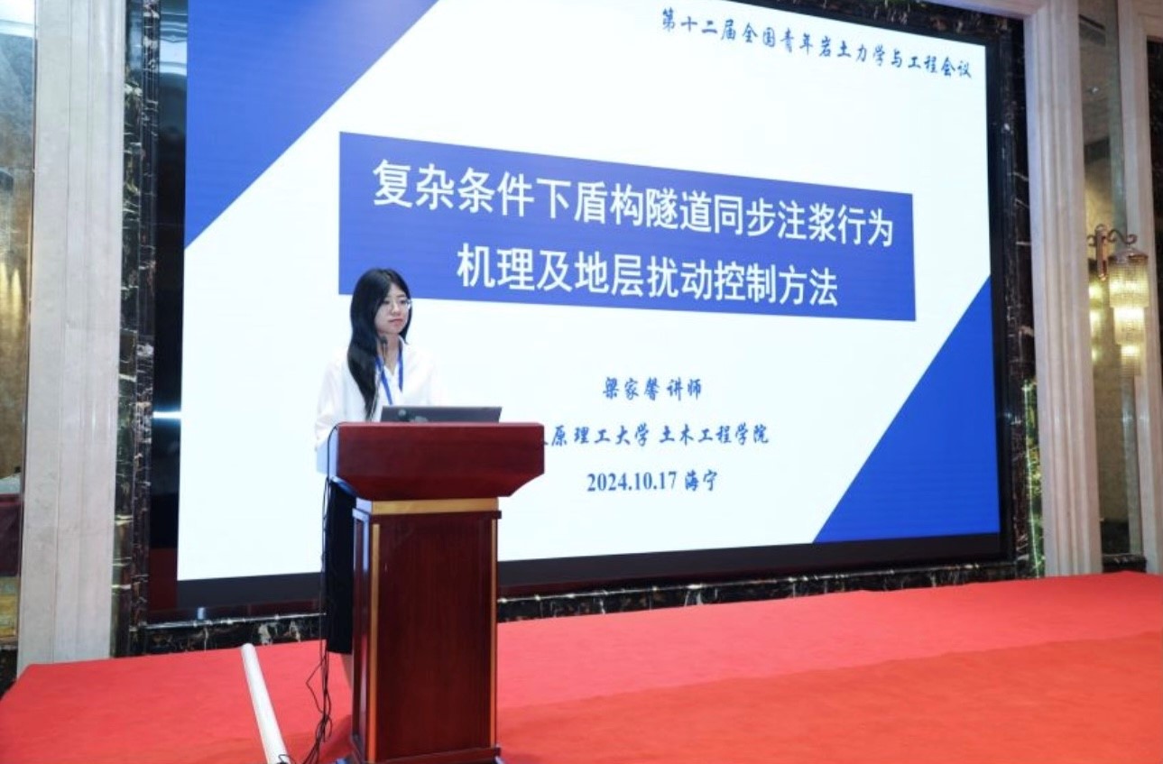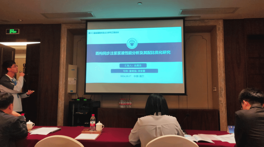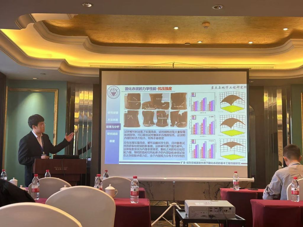 本次会议期间还举行了研究生学术报告会,旨在搭建一个专注于岩土力学与岩土工程领域的学术交流平台,鼓励研究生深入探讨岩土力学与岩土工程的前沿技术、创新应用及可持续发展路径。在报告会上,永利官网岩土与地下工程研究所董晓强教授的两位博士生崔雯雯、赵晨浩和硕士生贺高乐分别作了题为“基于单纯重心法的全固废赤泥基胶凝材料设计及其水化动力学特性研究”、“盾构同步注浆浆液性能分析及其配比优化研究”和“矿渣-硅灰在碱激发作用下固化赤泥的基本工程性能研究”的学术报告。另外,岩土与地下工程研究所何斌副教授的三位硕士生刘嘉江、朱佳敏和刘克难也分别作了题为“复合絮凝-电渗-固化联合处理高含水率工程泥浆试验研究”、“CFB 粉煤灰抗硫酸盐腐蚀特性研究”和“磷酸激发铁尾矿基地聚物固化油田钻井污泥”的学术报告。