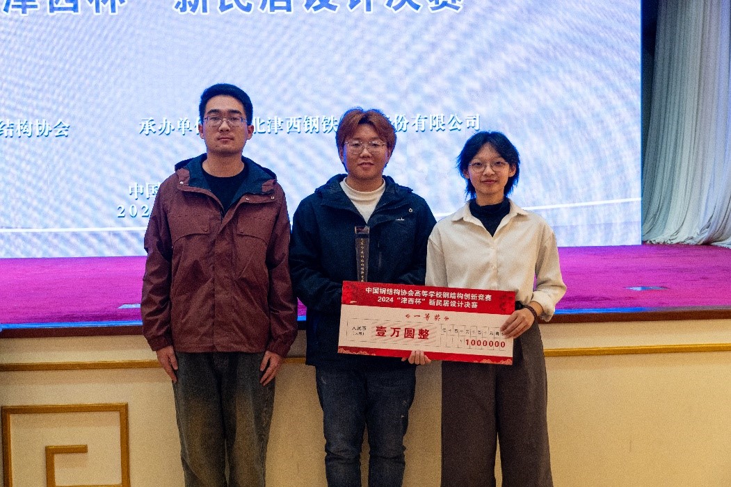 2024年10月21日,中国钢结构协会高等学校钢结构创新竞赛“2024‘津西杯’新民居设计决赛”在北京举行。由永利304官网唯一张蕾、王帅勇、渠强强,建筑与艺术学院李佳芸、欧阳圆、闫晨蕾组成的学生代表队,在雷宏刚教授、程欣教授、邱斌老师和建筑与艺术学院雷泽鑫老师的联合指导下,经过初评和现场答辩评审,以优异的成绩从进入决赛的25支全国高校队伍中脱颖而出,以总分第2名的成绩获得大赛一等奖!