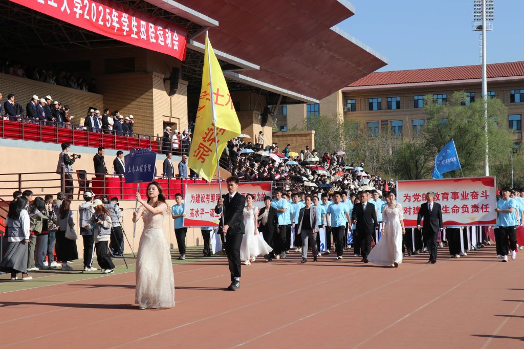 随着阳光洒满操场,校园运动会的序幕拉开,伴随着激昂的《运动员进行曲》,学院方阵在党委书记赵惠民,党委副书记芦倩,副院长刘元珍、副院长张翛的带领下,迈着整齐有力的步伐步入操场。他们身着统一且充满活力的院服,步伐坚定,队员们以方阵为中心,巧妙地运用手中的道具拼成了巨大的“土承天下,木撑苍穹”口号,这不仅是学院专业精神的体现,更向全校师生展示土木学子的团结、协作和进取的精神。