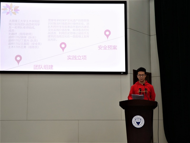 学院七支集中社会实践优秀队员代表结合实际分享了自身实践心得和体会,分享自己在暑期实践中的所感所想,以及遇到的困难和最终的收获。“赴陵川暑期实践队“、“赴马圪当乡避暑康养度假园社会实践队”队员丁嘉兴、麻弘胤以“感悟生活、锻炼才干”为主题讲述他们在社会实践中如何克服重重困难,用墙体彩绘的方式展现乡村文化,丰富村民生活,传承古老文化;“汾西县勍乡西村扶贫队”队员苗强以“助力脱贫攻坚,奉献青春力量”为主题,讲述他们深入国家重点扶贫乡村,整理扶贫资料,深入贫困户了解实际情况,并克服重重困难,争分夺秒在短短三天内完成100多户贫困家庭资料整理、登记、完善等工作。切实为脱贫攻坚贡献自己一份力的经历;“红色之旅实践队”队员申勇帅从“教学相长”、“增进友谊”两个关键词出发总结他的社会实践经验;“赴晋城社会实践队”队员王奇琪讲述了他们“增长见识、弘毅笃行”的实践经历;“数学建模大赛实践队”、“道桥一队社会实践队”也分别从夯实专业知识、体验竞赛乐趣等方面展示了他们的实践成果。