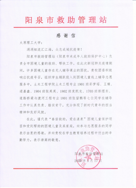 3月17日,永利官网收到了来自阳泉市救助管理站的一封感谢信。信中向永利官网永利304官网唯一的七名同学表达了真诚的感谢,感谢他们在此次防控新冠肺炎疫情期间为困境儿童开展线上辅导志愿服务。这七名同学是来自土木工程专业1901班彩梦瑶、王璞、逯嘉鑫,1904班张英英,1802班袁凯龙,1703班郭煜东,以及道路桥梁与渡河工程专业1801班张留鹏。