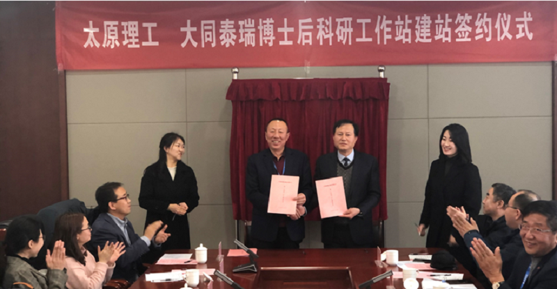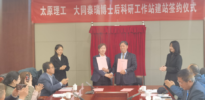 董晓强与张扩忠签订了博士后科研工作站建设协议,为太原理工-大同泰瑞科研中心揭牌。李海旺与任旭红签订了四项技术合作协议,标志着产学研合作正式落地。