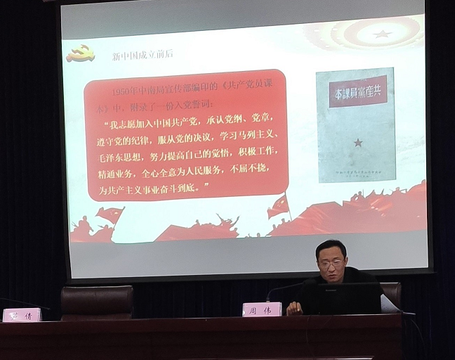 动员会后,院党委书记周伟以《入党誓词的演变》为题,重点介绍了中国共产党在各个时期入党誓词的变化。通过入党誓词的变化可以看出,中国共产党在领导中国革命建设改革的伟大实践中,坚持把马克思主义的普遍原理与中国的实际相结合,不断推进马克思主义中国化,及时地把实践发展中的成功经验和党的理论创新成果反映到党章中来,反映在入党誓词中。