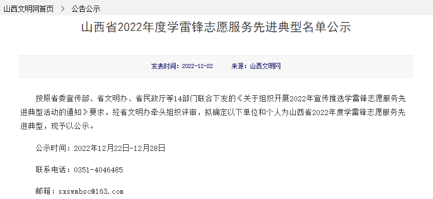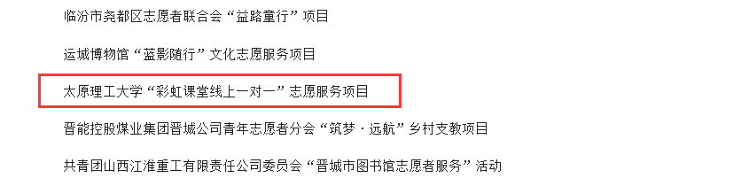 2022年12月22日,按照省委宣传部、省文明办、省民政厅等14部门联合下发的《关于组织开展2022年宣传推选学雷锋志愿服务先进典型活动的通知》要求,经省文明办牵头组织评审,“永利304官网唯一‘彩虹课堂线上一对一’志愿服务项目”入选为山西省2022年度学雷锋最佳志愿服务项目。