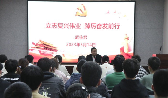 武佐君首先向同学们介绍了学院整体工作情况,强调学生满意是学院工作的指向,号召大家戮力同心,携手并进,以主人翁的意识,建设者的姿态,共同推动学院各项事业持续高质量发展。随后,武佐君围绕党的二十大报告展开讲述,细数关键重点,讲解精髓要义,精准回归实际,以理论的穿透力、思想的震撼力、精神的感召力激励同学们自觉听从党和人民的使命召唤,积极投身新时代中国特色社会主义伟大事业。同时,他以中共二十届一中全会、中共二十届二中全会和2023年全国两会为切入点,结合我国经济社会发展取得的巨大成就,鼓励同学们勇于担当,善于作为。号召同学们要更加紧密地团结在以习近平同志为核心的党中央周围,用党的创新理论武装头脑,学习宣传贯彻党的二十大精神,准确理解中国式现代化道路,坚定理想信念、厚植家国情怀、勇担历史使命、走在时代前列、争做复兴栋梁,用青春谱写中华民族伟大复兴的光辉乐章。