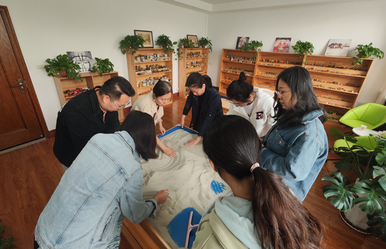 一沙一世界,一盘一乾坤。为加强辅导员队伍心理健康教育水平,不断提升辅导员职业能力与心理素养,调适心境和舒缓工作压力,永利官网于4月20日上午在学校学生心理健康指导中心开展主题为“探索自我,为心赋能”团体沙盘体验活动,学院党委副书记芦倩以及全体辅导员参加。此次活动邀请了学校学生心理健康指导中心芦朝霞老师带领辅导员老师们进行团体沙盘游戏。