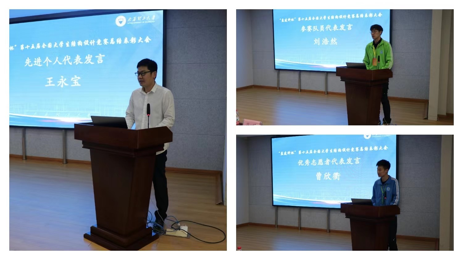 先进个人代表王永宝老师发言,他回顾了永利304官网唯一在结构设计竞中从默默无闻到取得佳绩的艰辛历程,希望下届竞赛中永利官网参赛队员能再创辉煌。参赛队员代表刘浩然同学发言,他讲述了在参赛过程中的付出与成长,道出了土木学子笃实奋进、勇敢追梦的坚持与奋斗,代表全体参赛队员表达了对指导老师、竞赛筹备组老师、竞赛志愿者的感激之情。优秀志愿者代表曹欣衢同学发言,他讲述了本次大赛志愿者坚守岗位,不怕困难,迎难而上的工作精神和志愿风采。
