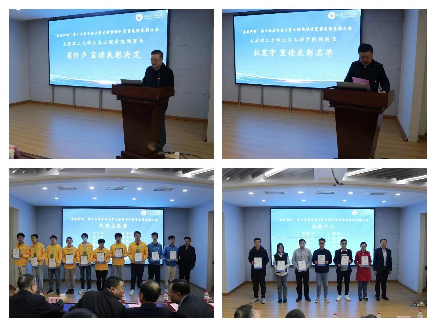 葛忻声宣读了第十五届全国大学生结构设计竞赛组委会关于表彰先进个人和优秀志愿者的决定。杜震宇宣读了第十五届全国大学生结构设计竞赛个人和优秀志愿者表彰名单。与会领导为每一位获奖老师及同学颁奖。