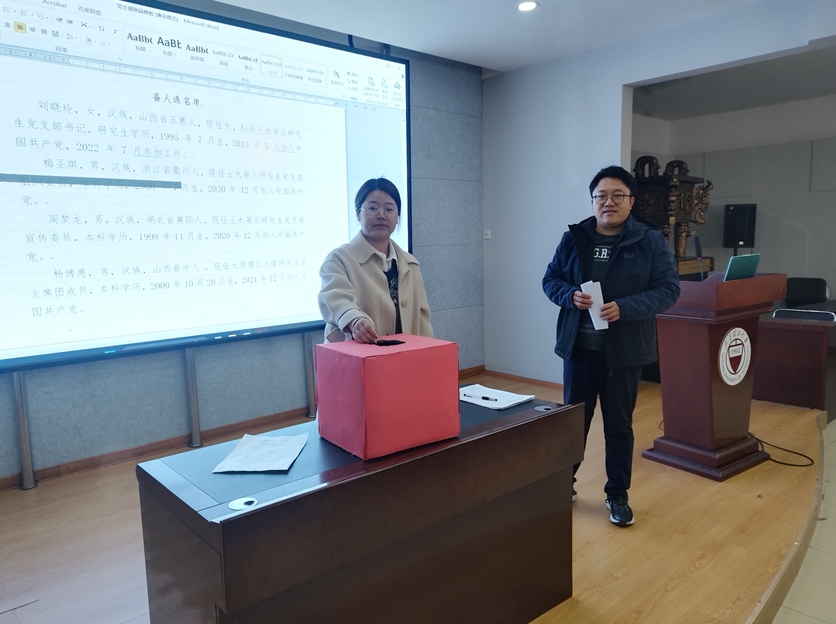会上,上一届党支部书记师希望同志向大会作了工作报告,总结回顾了党支部上一年来的工作情况,大会充分审议并通过了工作报告。随后,会议按照选举规定,依次审议通过了选举办法、候选人名单、监票人名单以及计票人名单,并经到会正式党员的无记名投票,差额选举出了新一届党支部委员会。随后召开新一届党支部委员会第一次会议,会议选举刘晓玲同志担任土木第五研究生党支部书记,梅圣琪同志担任支部组织委员兼纪律检查委员,周梦龙同志担任支部宣传委员。