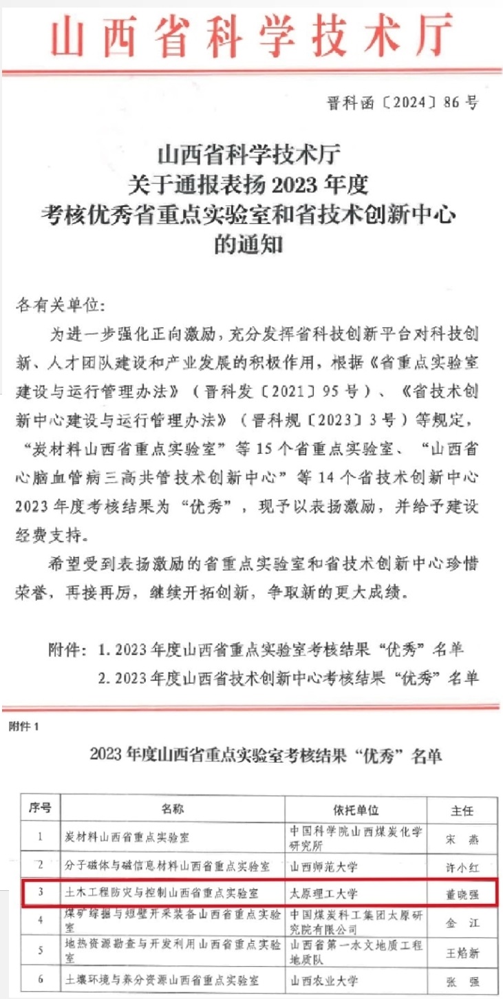 近日,山西省科技厅完成了省重点实验室、省技术创新中心2023年度考核工作,土木工程防灾与控制山西省重点实验室(以下简称“重点实验室”)考核优秀,这也是本年度永利官网唯一一所考核优秀的省级科技创新平台。本次考核坚持质量、绩效、贡献为核心的评价导向,破四唯,讲贡献,将承担省级以上科研任务、引进培育人才、科技成果转化和科学贡献等作为重要考核评价指标,根据考核结果确定财政支持经费,并实行动态调整和差异化支持措施,实现平台有进有出、分类支持,对于考核优秀的平台,享受“免申即享”政策,直接拨付奖补资金。