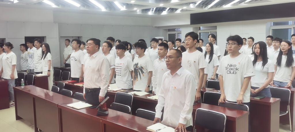 会议伊始,全体与会党员肃立,齐声高唱国歌,激昂的旋律在报告厅内回荡,展现了党员们的爱国情怀和坚定信念。