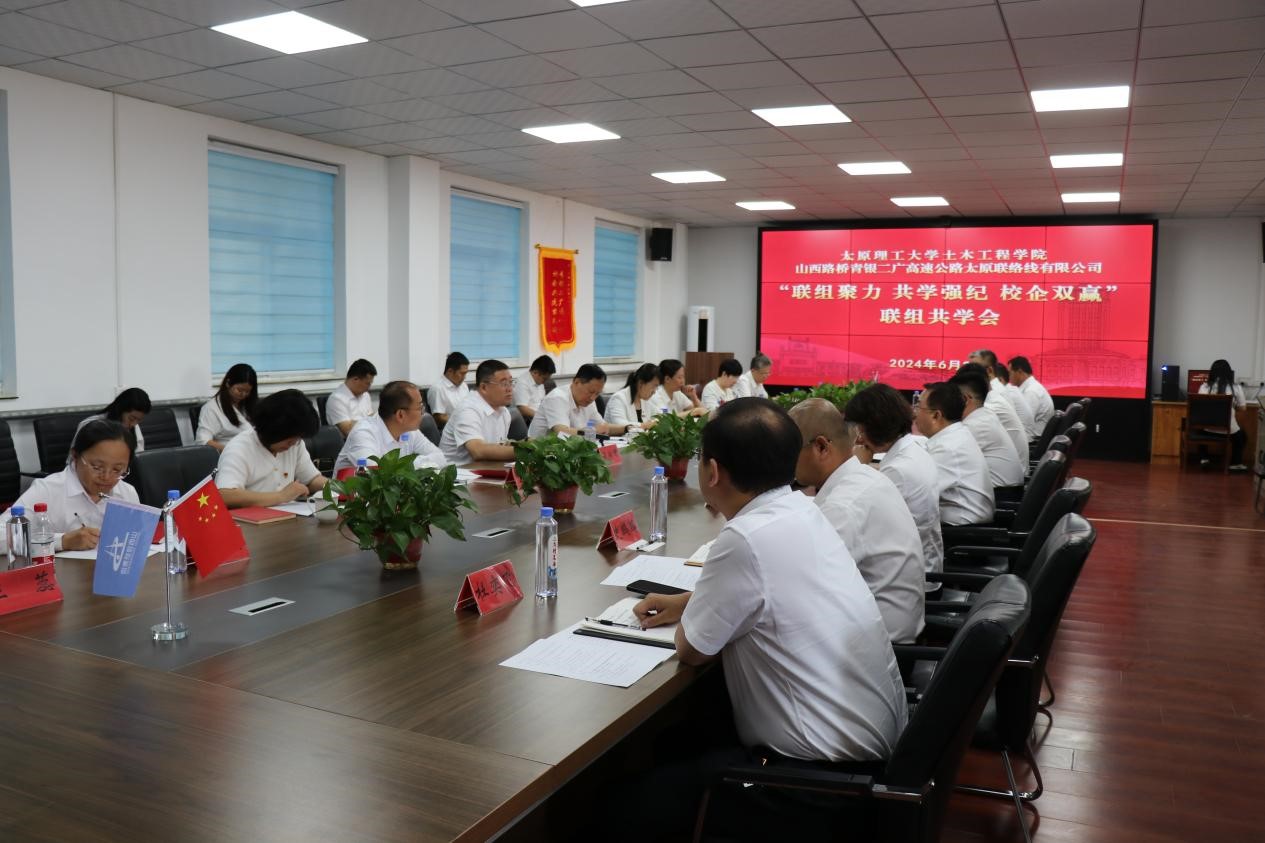 6月25日上午,院党委与山西路桥青银二广高速公路太原联络线有限公司党支部在太原联络线公司四楼会议室召开理论学习中心组“联组聚力 共学强纪 校企双赢”主题联组共学会。研究生院院长、永利官网院长董晓强,组织部副部长谢鹏华,永利官网党委副书记芦倩及学院各部门负责人,系部中心主任,党支部书记参加会议;太原联络线有限公司党支部书记、董事长田正旺,支部副书记、副董事长、总经理韩永宏,支部委员、董事、副总经理宋竹兵,支部委员、工会主席秦志红及公司领导班子成员参加会议。永利官网党委书记武佐君主持会议并讲话。