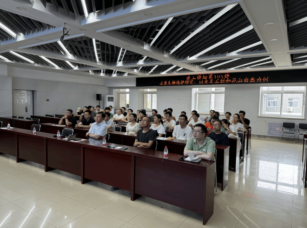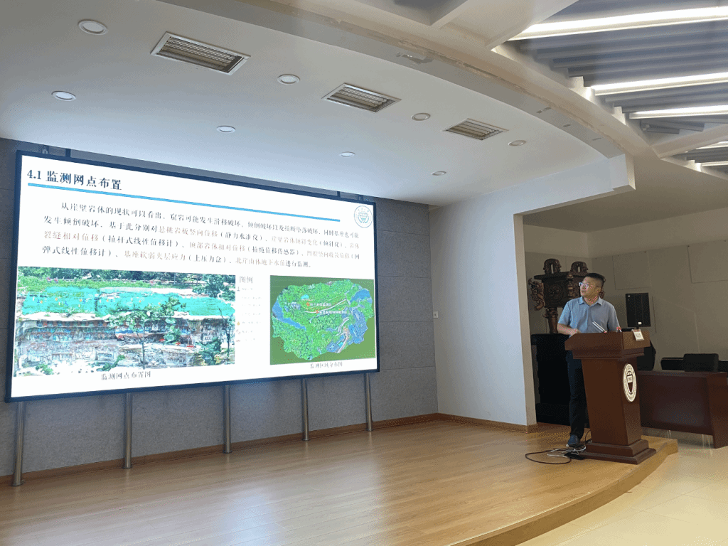 本次报告中,仉文岗教授以“保护第一、加强管理、挖掘价值、有效利用、让文物活起来”新时代文物工作方针为引,重点讲解了宝顶山大佛湾崖壁岩体精细化建模与稳定评估方法,系统阐述了温度-渗流-应力-化学多场耦合作用下崖壁岩体强度劣化机制与失稳模式,分享了其研究团队从岩土工程角度出发助力文保工作的最新进展。在会后互动环节,仉文岗教授与永利官网师生就精细化建模方法、机器学习与智慧岩土、文保工作多学科交叉融合等问题进行了深入交流探讨。