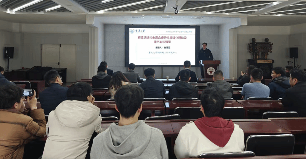 白涌滔教授以《桥梁钢结构全寿命疲劳性能演化理论及损伤本构模型》为题进行了学术报告,报告首先围绕钢结构全生命周期内的性能演化与理论建模,详细介绍了钢结构在服务期间的性能演化机理、钢结构表面激光强化原理与性能提升(表面微观结构、压缩残余应力、疲劳寿命与裂纹扩展速率)技术以及声子晶体超材料振动控制与缺陷识别技术的应用;而后,以自己申请德国洪堡基金会项目及日本学术振兴会(JSPS)项目的经历作为案例,详细阐述了两大科研资助体系在评审机制、学术偏好及文化适应性方面的关键性差异,并从申请者视角剖析了研究课题制定、计划书撰写、同行评议要等核心环节的实战经验。