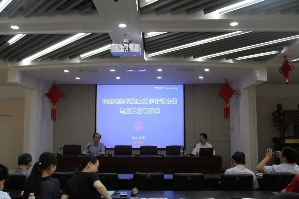 罗教授首先介绍了现代钢结构“高、大、复”的特点,以及这些特点所带来的问题,指出钢结构需要从结构分析与设计方法、施工技术、施工控制技术等方面加以改进和创新。并从现代建筑钢结构施工安装方法、钢结构施工过程中的力学特点、施工过程的模拟分析方法、施工过程控制技术等方面做了详细讲解。整个报告由浅入深,扩充了钢结构研究方向师生的现场施工技术和理论基础,与会师生都表现出极大兴趣。