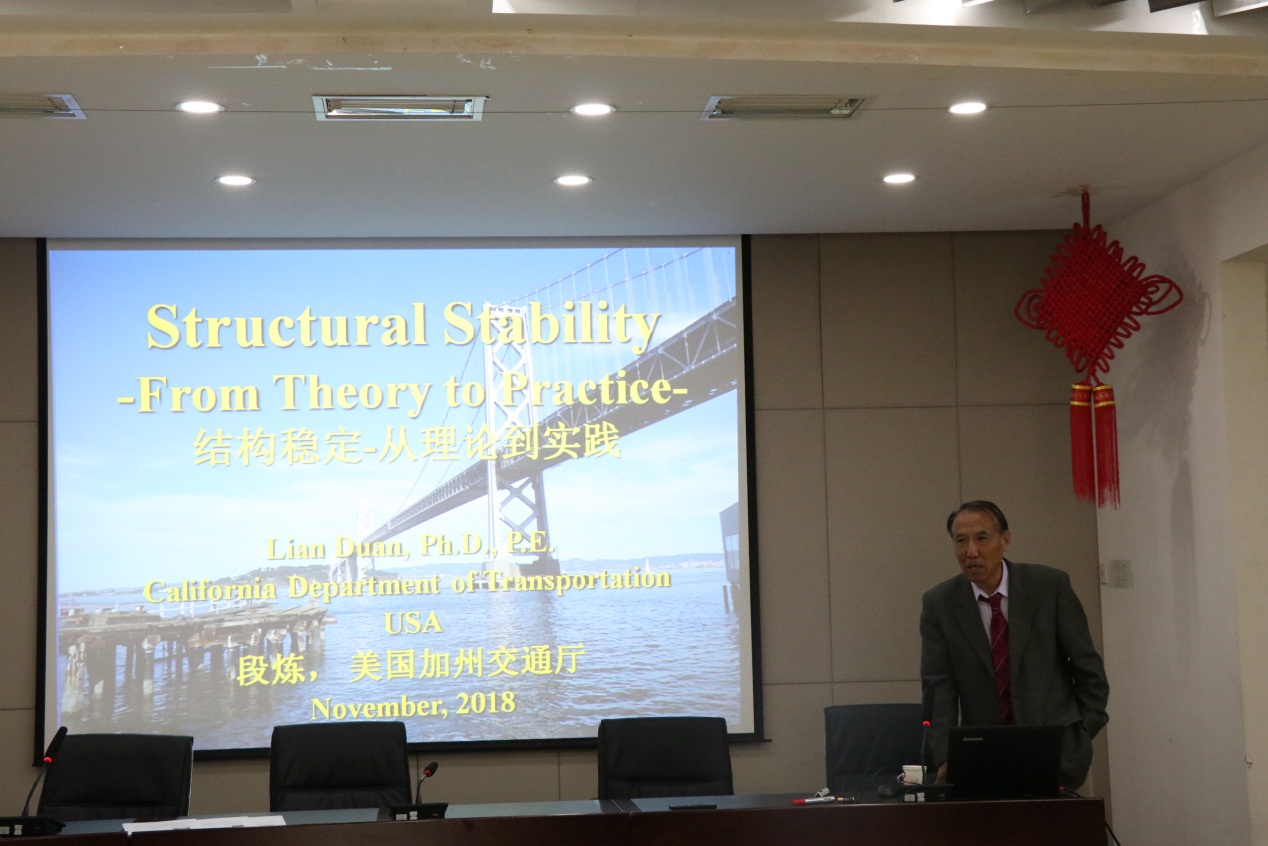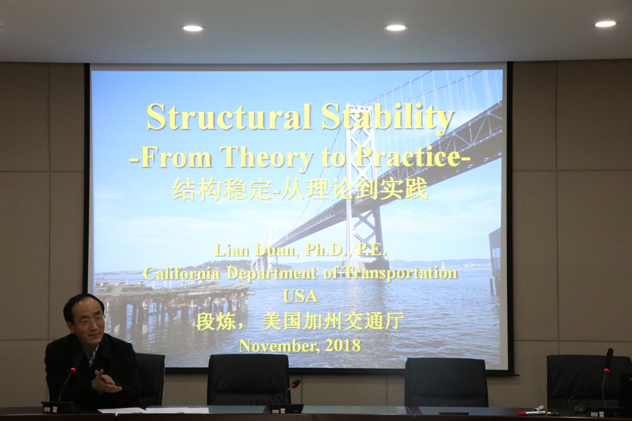 应建工学院的邀请,美国加里福尼州交通厅钢结构委员会主席、资深桥梁工程师段炼于2018年11月7日到访永利官网,在博学馆五层报告厅做了主题为“结构稳定——从理论到实践”的学术报告,由雷宏刚院长主持,土木系师生100余人聆听了此次报告会。