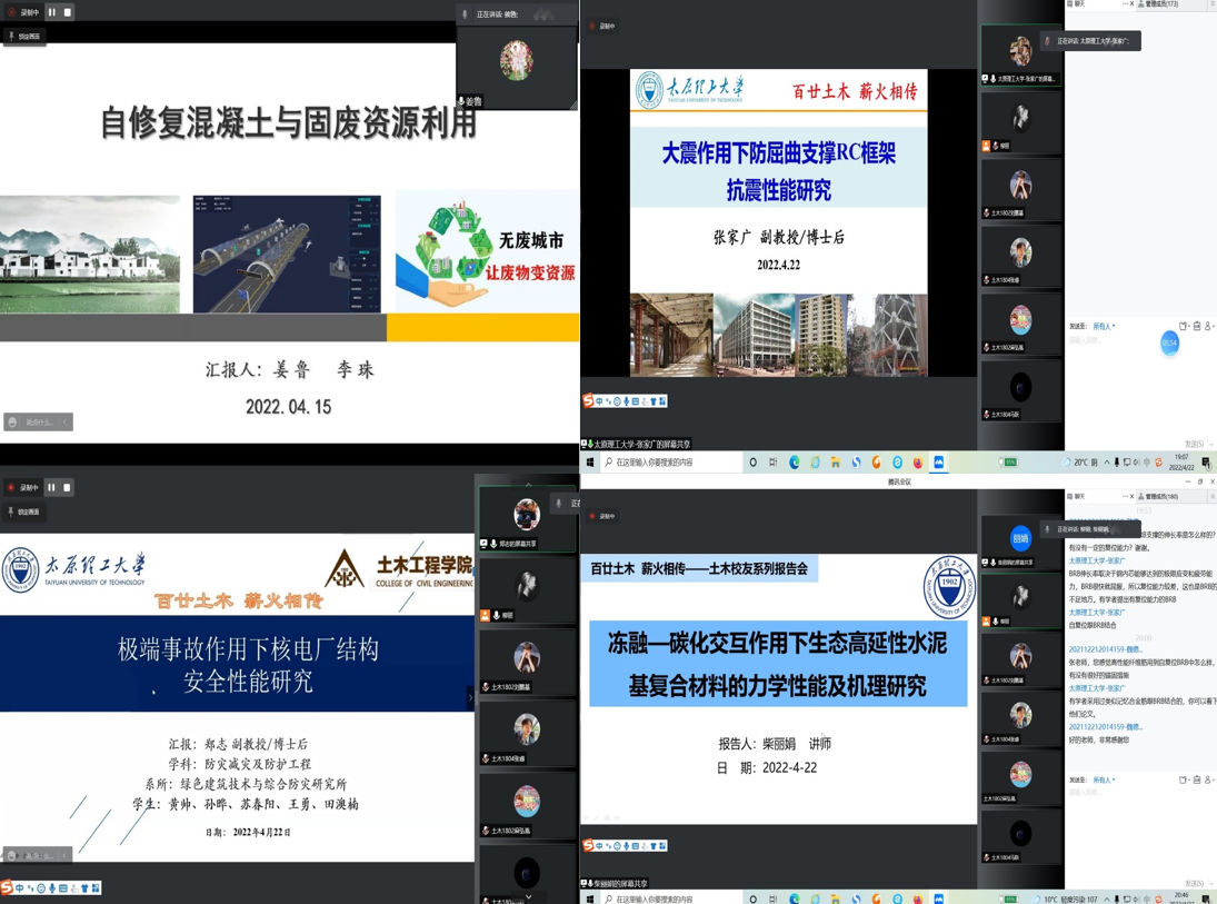 为庆祝永利官网120周年校庆,进一步帮助永利304官网唯一的同学们了解土木工程学科的前沿,拓宽思路,培养科创意识、科创能力,明确科研方向、凝炼研究内容和关键科学问题,永利304官网唯一特推出“百廿土木传薪火,接续奋进谱新篇”系列报告会——科研讲座,分别于4月15日和4月22日晚上在线上视频召开。报告会由学院建工系系主任刘元珍教授主持。出席会议的有:“学校校友、永利官网2014届结构工程专业工学博士毕业生”中国地质大学(武汉)地大学者王文婧副教授,“学校校友、永利官网2018届结构工程专业工学博士毕业生”山西大学贾冠华副教授,“学校校友、永利官网2020届结构工程专业工学博士毕业生”宁夏大学青年学者姜鲁讲师、永利304官网唯一张家广副教授,永利304官网唯一郑志副教授,永利304官网唯一柴丽娟讲师,永利304官网唯一2018级全体本科生、2021级研究生线上线下共计200余人。