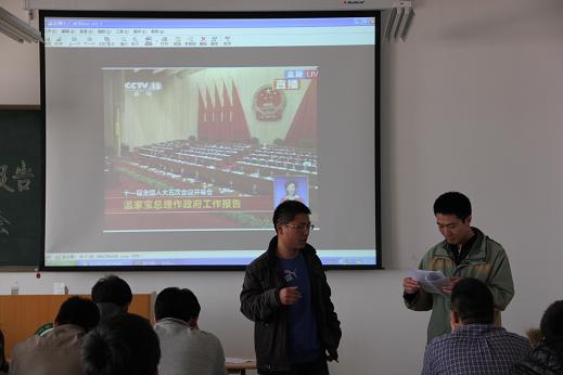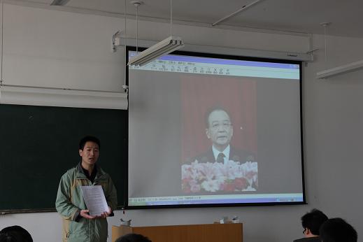 3月27日下午,机械学院学生第四党支部在临潼校区10-501教室,举行了学习国务院总理温家宝2012年政府工作报告的组织生活会,会议由党支部书记张立显主持。张立显首先向全体学生党员解读了国务院总理温家宝2012年政府工作报告全文,然后和学生党员们一起讨论了相关热点问题,强调了学习2012年政府工作报告的重要意义。整场组织生活会热情高涨,全体学生党员纷纷表示,在以后的工作中要勤奋工作,为社会主义建设贡献自己的力量。