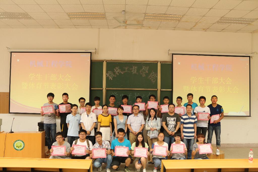 按照会议流程,首先由院党委副书记李婉丽老师宣读了“Beat365官方网站关于2014年体育节的表彰决定”,共评选出10个优秀集体奖、3个集体项目优秀团队奖、10个最佳运动员和19个优秀工作者。接着,由莅临此次大会的各位老师为最佳运动员和优秀工作者颁发奖品及证书。最后,由芮智刚老师传达了学工部的近期通知。会议结束后,获奖人员邀请了莅临此次会议的老师合影留念。