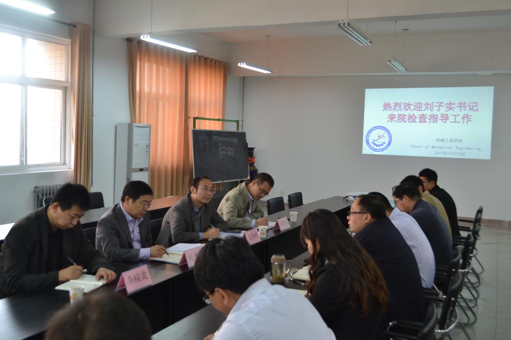 刘子实书记认真听取了汇报,对学院领导班子对学生工作的支持表示感谢,对机械学院学生工作取得的成绩予以充分肯定。他认为机械学院班子团结、风气正、学风好、工作突出,学生工作以“人才培养”为核心,第一课堂和第二课堂有效结合,全员化氛围较浓,“三全育人”格局凸显。刘子实书记最后强调,一是学生工作要以“立德树人”为根本任务,全力做好学生教育管理服务工作。重视和加强学生党建、思想政治教育、社会主义核心价值观等意识形态方面的教育,用理论武装青年学生;重视和加强学生养成教育,促进学生形成良好的学风和行为习惯;重视和加强学生学业、就业、心理等指导服务工作,解决学生实际困难。二是要加强队伍建设。不断加强辅导员队伍自身建设,要以身作则,严于律己,做好学生思想工作本职,加强与学生的感情融合,以情动人,用正气和正能量带动学生;学院领导支持、增强学生工作的全员性,在组织上、政治上、生活上支持学工干部,突出人文关怀。共青团要找准定位,加强组织建设,开展好科技服务、文体活动和志愿服务工作,不断提升共青团工作的影响力;三是要做好稳定安全工作,对学生情况做到心中有数,有针对性的开展工作,充分发挥学生党员、干部骨干在安全稳定工作中的作用,增强学生教育管理的成效。
