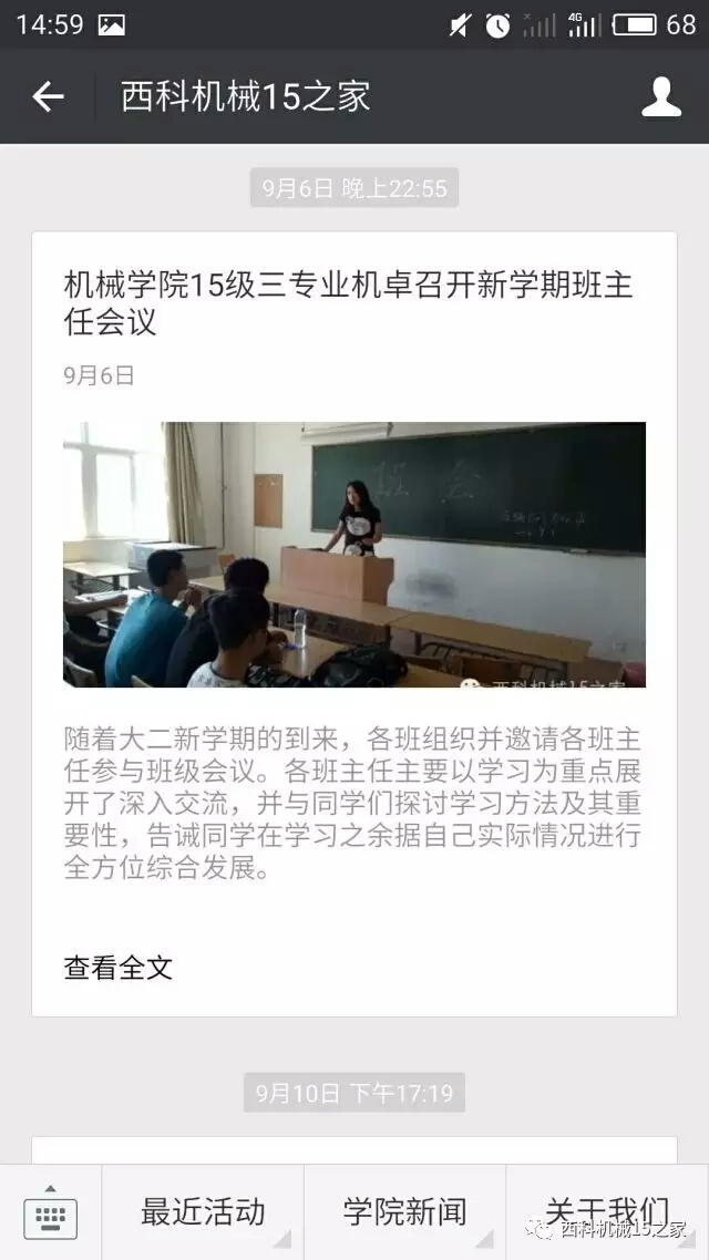 开通运行了“西科机械15之家”微信平台,展示、宣传年级工作,推送学生日常管理的相关制度、评优结果等信息60余条,如:团日活动、辩论赛、一二九大合唱、女生座谈会、志愿者活动等,形成线上线下的思想政治教育工作模式。