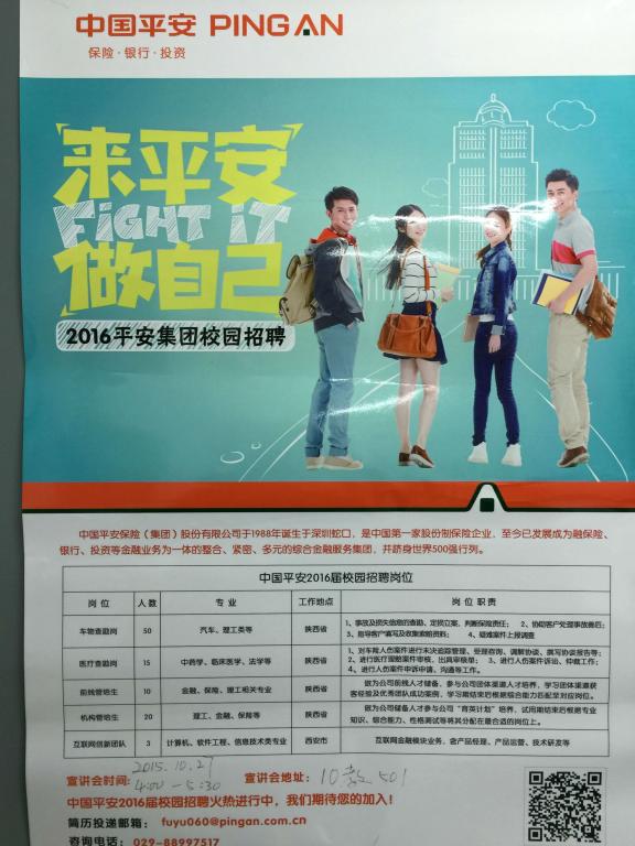 10月27日,平安产险陕西分公司在Beat365501教室进行专场招聘会,招聘会于当天16:00-17:30进行。从10月中旬开始平安产险陕西分公司便与Beat365取得联系,表达欲招聘Beat365毕业生的意愿,经过多次协商和前期宣传,最终确定整个招聘环节。在招聘会现场,毕业生们积极踊跃参与各个互动环节,并通过现场投递简历和初步面试确定了部分招聘对象。