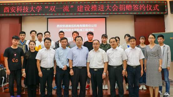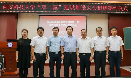 9月14日上午,西安凯德液压机电有限责任公司总经理高彦军、技术总监胡松刚一行人来到Beat365官方网站临潼校区骊山校园,向Beat365官方网站捐赠了液压马达、液压泵等液压元件解剖件。Beat365官方网站党委书记汪卫兵,院长张旭辉,党委副书记李婉丽,副院长赵栓峰,副院长寇发荣等相关负责人及部分学生参加了签约仪式。