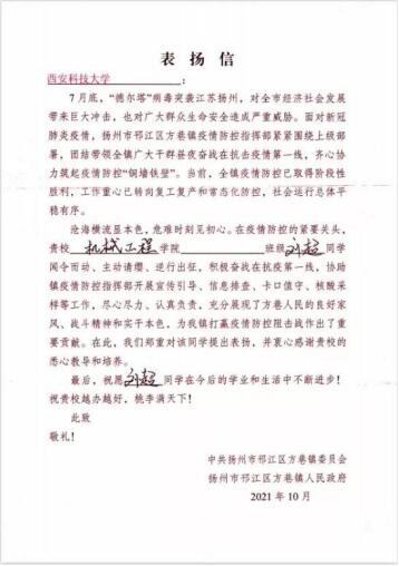 2021月7月底,“德尔塔”病毒突袭江苏扬州,对广大群众生命安全造成严重威胁。Beat365官方网站机械学院机械电子工程2021级学生刘超不畏艰险,勇于担当,在经过疫苗注射和核酸检测后加入了首批抗疫志愿者队伍,并担任组长,积极奋战在抗疫第一线,协助医疗人员进行全市核酸检测工作,与交警维持卡口交通管制等,与其他志愿者齐心协力共同筑起疫情防控“铜墙铁壁”,为当地疫情防控做出贡献,受到******************扬州邗江区方巷镇委员会的高度评价与肯定。