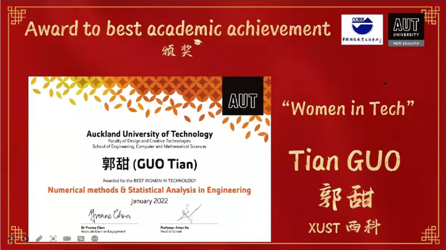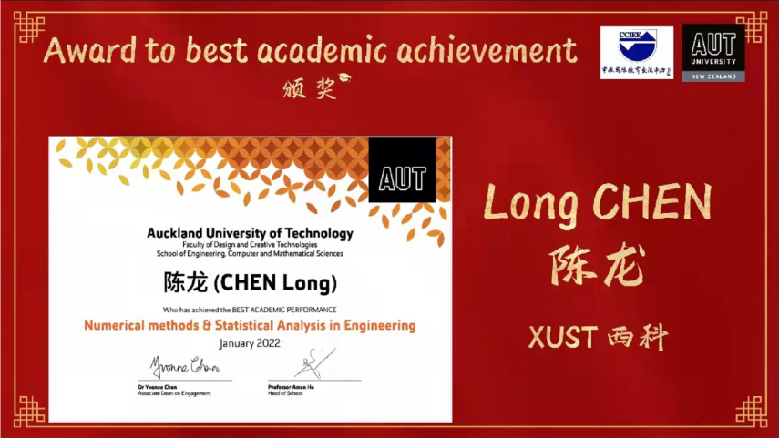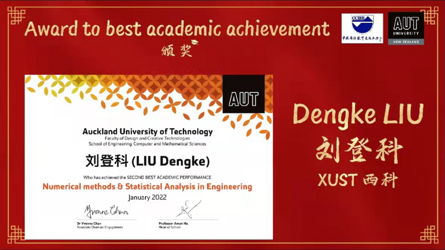 《Numerical Method & Statistical Analysis in Engineering》课程由奥克兰理工大学David Wilson教授主讲,机械学院赵江滨博士任助教。在为期12周的教学活动中,机械学院选修该课程的27名研究生表现突出,全员通过课程考核,其中陈龙、刘登科、郭甜三名研究生凭借优异的成绩排名分别荣获该课程设立的三个奖项“The Best Academic Performance” “The Second Best Academic Performance”和“The Best Woman In Technology”奖项。