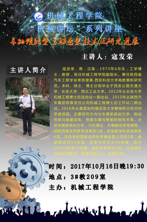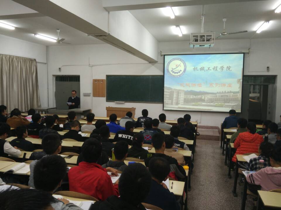 1016日晚,在临潼校区3209教室,机械学院举办“机械讲坛”第四讲,报告会由2015级辅导员芮智刚主持,2015级车辆工程专业全体本科生,其他年级学生代表一百余人参加了讲座。