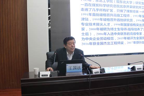 王国法,煤炭开采技术与装备专家,山东省文登人,1982年1月毕业于山东工学院(现山东大学)机械系,1985年东北工学院(现东北大学)硕士研究生毕业,现任中国煤炭科工集团(煤炭科学研究总院)首席科学家,2017年当选中国工程院院士。我国煤炭高效综采技术与装备体系的主要开拓者之一。创新提出了液压支架与围岩“强度耦合、刚度耦合、稳定性耦合”的“三耦合”原理和设计方法,主持设计研发了世界最大采高的8.2m超大采高综采和20m特厚煤层综放、世界最小采高的0.6-1.3m薄煤层智能化综采和最大倾角的55°大倾角综采等系列综采成套技术与装备,推动了煤炭开采技术变革和综采装备由引进发展到出口世界主要产煤国家。获国家科技进步一等奖1项、二等奖4项和三等奖1项,30余项成果获省部级科技进步奖;出版专著6部,发表论文100余篇,第一发明人发明专利20余项。获得全国杰出工程师奖、孙越崎能源大奖等。