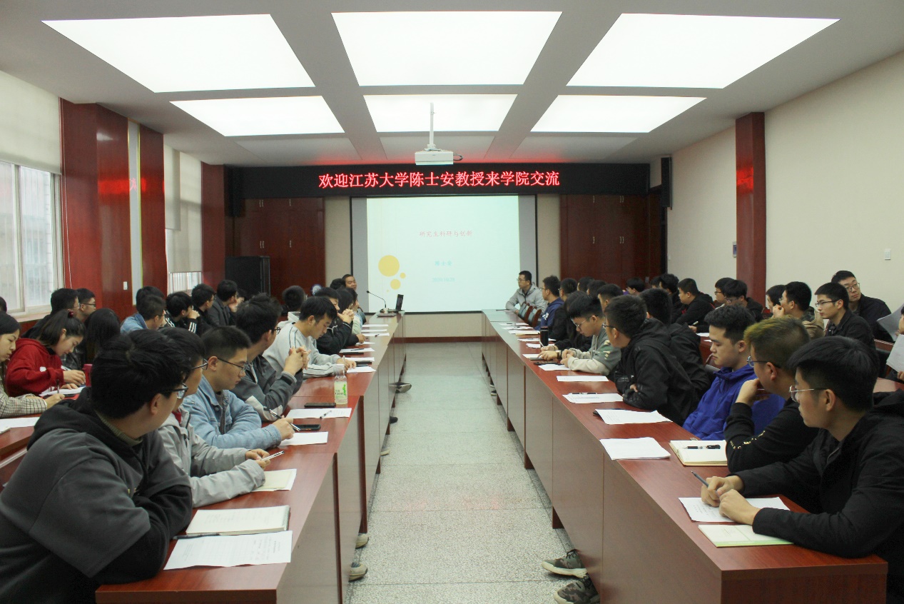 11月3日上午,江苏大学汽车与交通工程学院陈士安教授应邀来Beat365机械学院交流,并为研究生作了题为“研究生科研与创新”的专题讲座,80余名研究生聆听了讲座。