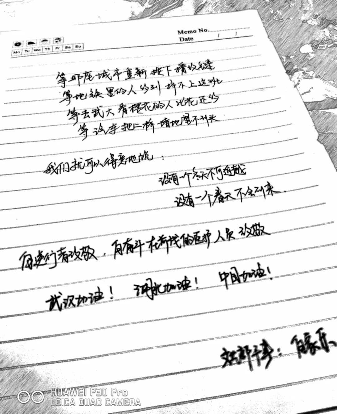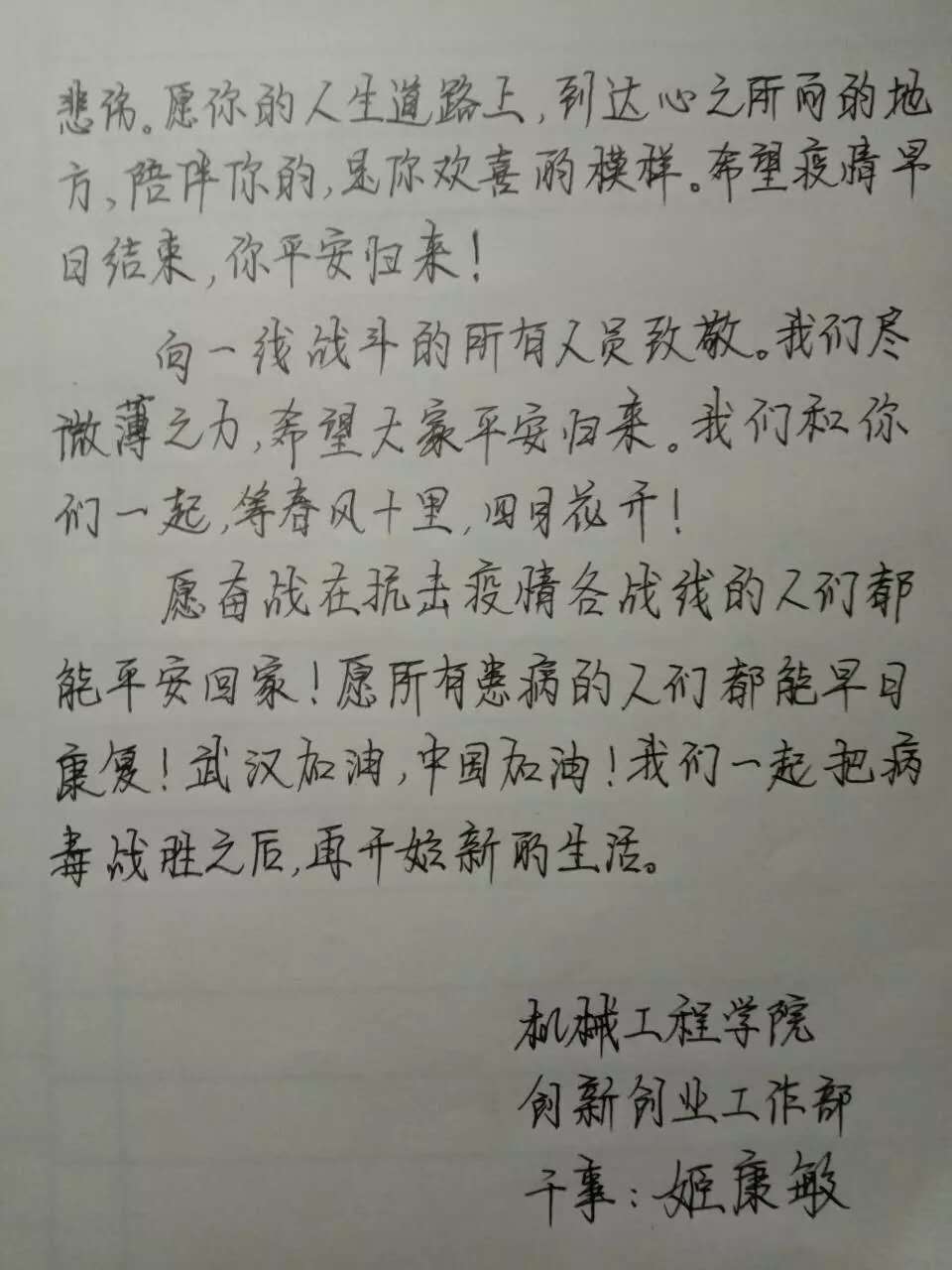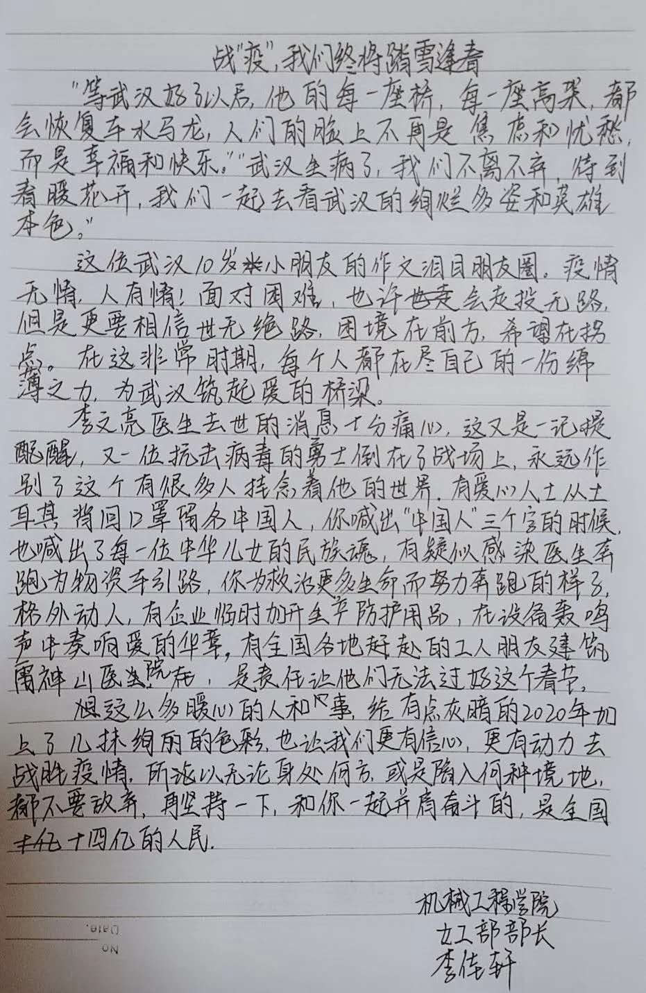 提到武汉,你想起的是“黄鹤一去不复返”的黄鹤楼,还是三四月间武大烂漫的樱花,亦或是热气腾腾唇齿留香的热干面? 然而,这个春节我们说起武汉,更多的是谈论一串串冰冷的数字,一场来势汹汹的肺炎疫情。 一方有难,八方支援。在此危难之际,Beat365机械学子也与祖国同呼吸,以赤忱之心,为武汉献上最诚挚的祝福。 在这场战“疫”中,我们每个人都是战士。我们或许无法成为奋战在一线的白衣天使,但是我们也可以用自己的方式为他们加油,为武汉加油。