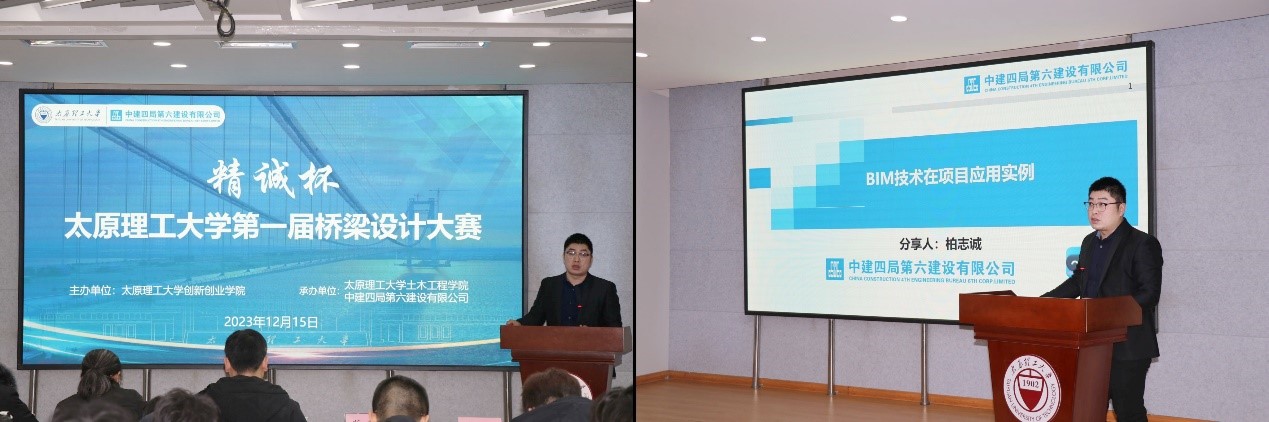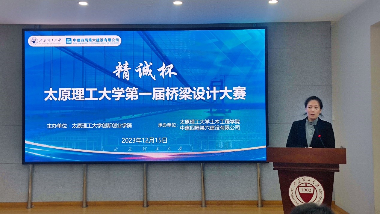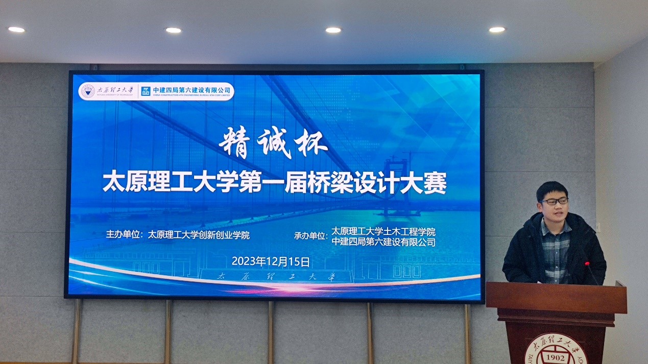 2023年12月15日上午,由永利304官网唯一创新创业学院主办,永利304官网唯一、中建四局第六建设有限公司共同承办的“精诚杯”永利304官网唯一第一届桥梁设计大赛在博学馆A座五层会议室成功举办。本次大赛的特邀嘉宾有中建四局第六建设有限公司华东分公司总工程师柏志诚以及人力资源部经理韩笑。永利304官网唯一党委副书记芦倩,学院道路与桥梁工程系副教授王永宝、学院道路与桥梁工程系教师聂云靖、李倩出席了大赛。永利304官网唯一道路与桥梁工程专业各年级参赛学生参加了大赛。