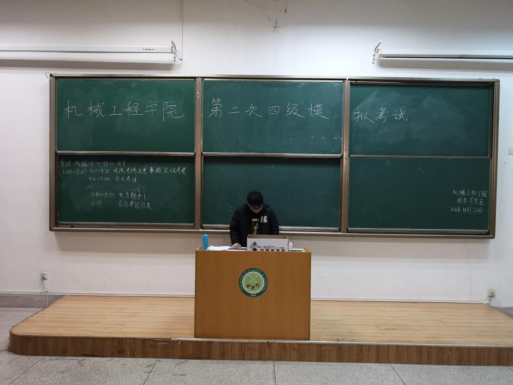 这次考试完全模拟正式考试的流程,学生在有人监考,杜绝手机的环境下,训练自己的答题能力。考试内容包括听力、阅读、写作、翻译四种题型。考试考风严正,纪律严明。考试过程中,学生们全神贯注,埋头做题,考场气氛严肃。