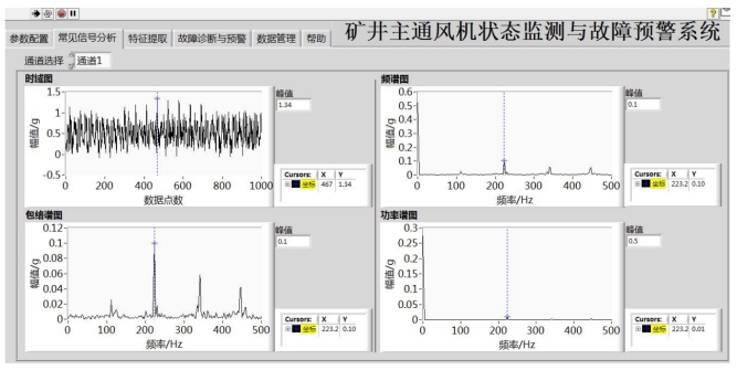 开发的“煤矿主通风机状态监测与故障诊断系统”如图1所示。为了实时监控煤矿主通风机的运行状态,设计了振动在线监测与故障诊断系统。系统接入振动信号,多个通道同步采集振动信息,经信号预处理后分别进行时域和频域分析;结合设备实际运行状况,设置故障阈值以判断设备当前状态和故障情况。在某煤矿主通风机上进行了生产现场应用验证,实际提取的通风机特征频率与理论计算值误差小于5%,证明系统功能正常、数据分析准确可靠。