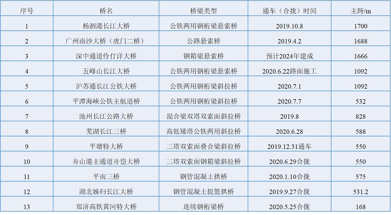 表1 2019~2020年已经建成或正在修建的大跨度桥梁