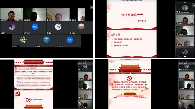 在党的99岁生日来临之际, 6月27日中共永利304官网唯一道桥系支部通过网络会议,举行了“践行领袖嘱托 率先蹚出新路”主题党日活动。会议围绕集中学习习近平总书记重要讲话重要指示、重温入党誓词和选举院优秀党员议题展开。