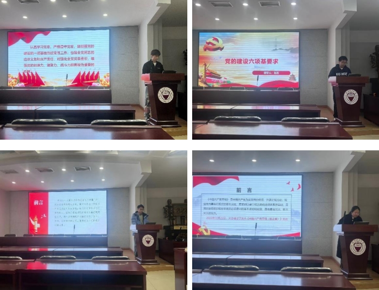在完成接收预备党员支部大会后,会议进行了领学党章的活动。领学人陈建秀、刘杰、任景洋、刘璐分别领学了“中国共产党章程”、“党的建设六项基本要求”、“习近平:开辟马克思主义中国化时代化新境界”和“党的二十大《中国共产党章程》修正学习”。在讲解过程中,领学党员与实际案例相结合,通过案例分析向全体党员展示了如何在实际工作中贯彻党章精神,落实党的政策和决议。此外,他们还鼓励全体党员在日常工作中要积极发挥先锋模范作用,带头遵守党的纪律和规定,切实维护党的形象和威信,支部党员就此进行了深入学习和讨论。通过领学党章活动,支部党员进一步加深了对党章的理解和认识,增强了党性意识和组织观念。同时,也为全体党员在实际工作中更好地发挥先锋模范作用提供了指导和借鉴。