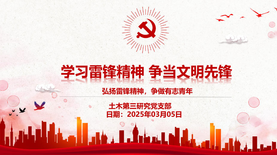 2025年3月5日,正值第62个“学雷锋纪念日”之际,土木第三研究生党支部在学院五层会议室举办学习雷锋精神的主题党日活动,全体党员参加,活动由支部书记何斌主持。活动主要通过主题宣讲、视频观影、交流研讨等形式,积极引导党员深刻领会雷锋精神的内涵,赓续中国共产党人的精神谱系。