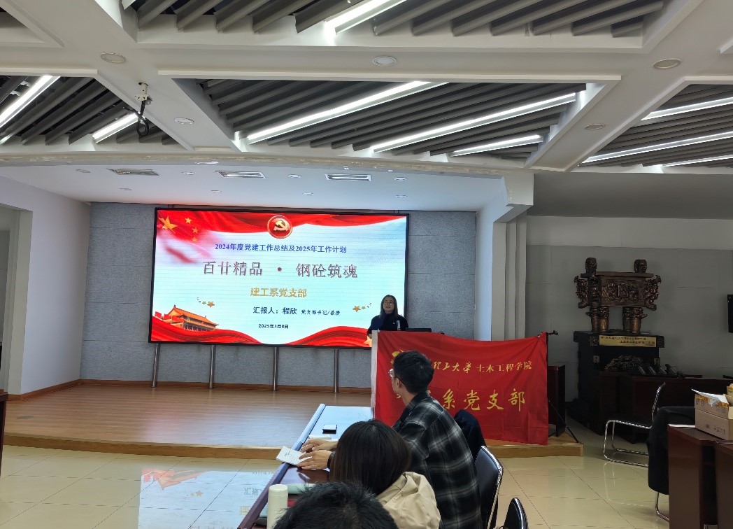支部书记程欣以“百甘精品 钢砼铸魂”为题系统汇报了支部近期工作成果及下一步工作思路。2024年,建工系党支部始终把党建引领作为事业发展的核心引擎,获批学校五星级党组织;组织师生党员开展沉浸式红色教育,队伍向心力显著增强;不断加强校企共建平台建设,与多家企业形成战略合作;档案管理提档升级,确保支部资料齐全规整。